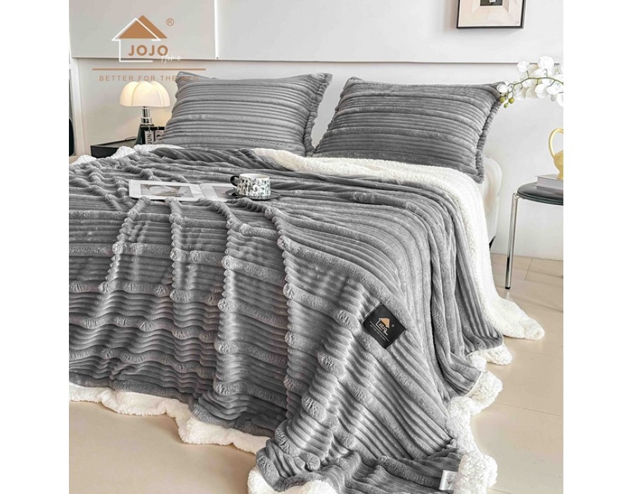Această pătură transformă orice dormitor într-un spațiu cozy și luxos. Exteriorul are o textură catifelată, cu dungi 3D delicate, iar interiorul este din blană pufoasă tip sherpa, perfectă pentru confort maxim în zilele reci.
