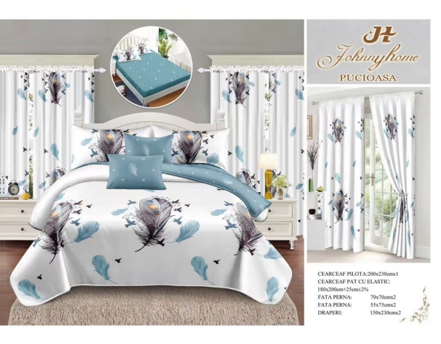 Lenjeria este imprimata in totalitate si coincide cu poza de prezentare. Cearceaful de pilota are 2 fete. Imprimeurile de pe fetele de perna pot fi diferite fata de poza de prezentare in functie de cum este taiat materialul in procesul de croire. Pot fi mici diferente de nuanta, in functie de pe ce ecran vizualizati fotografia(telefon, tablena, laptop, monitor, etc)