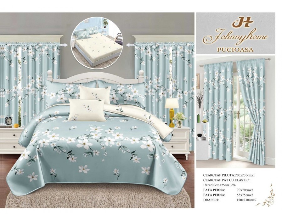 2 Draperii 150x230 cm din acelasi material si cu acelasi imprimeu ca lenjeria de pat. Au sistem de prindere universal si merg folosite atat pentru bara cat si pentru carlige sau inele.